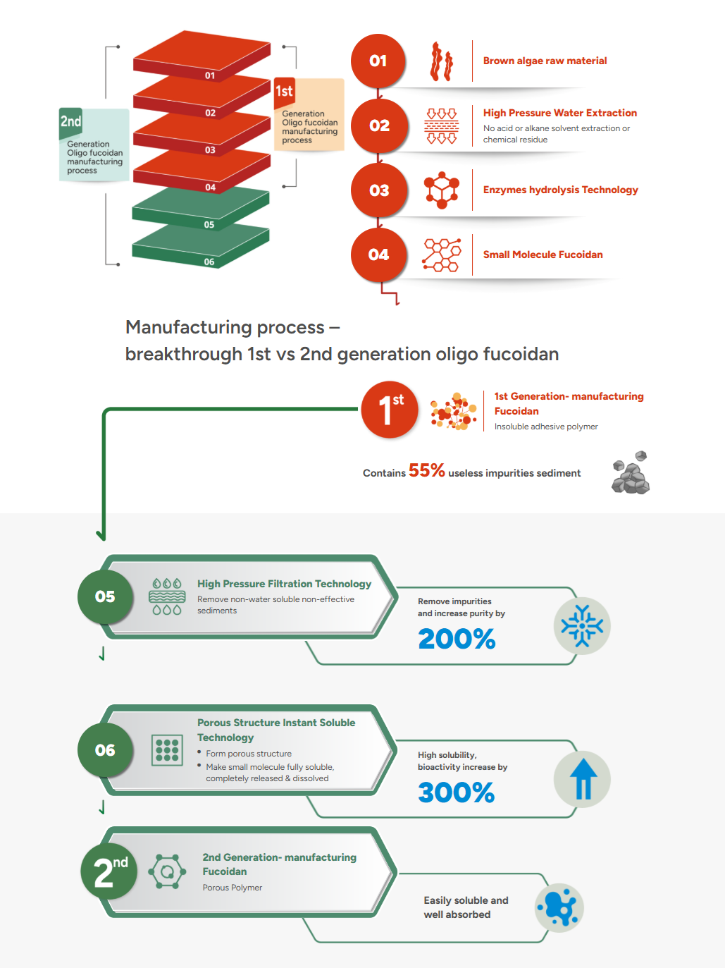 Leading the industry, the exclusive advanced technology manufacturing process: improving extraction evolution and upgrading the Second generation of low molecular weight fucoidan